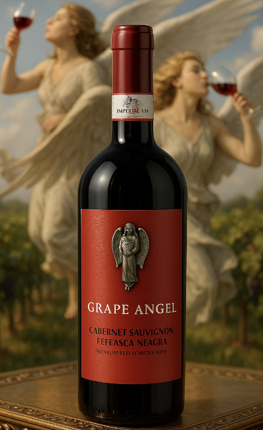 A Moldávia tem uma indústria vinícola comparável à dos principais países produtores do ocidente, fato que os brasileiros já vêm descobrindo recentemente. No sudoeste do País, próximo à fronteira com a Romênia e ao delta do Rio Danúbio, encontra-se a região de Valul Lui Traian (que leva esse nome por sediar as chamadas “Muralhas de Trajano”, que eram as fortificações do Império Bizantino erigidas na província romana da Mésia), uma das três denominações de origem do vinho moldavo e situada no mesmo paralelo das principais regiões vinícolas do mundo como, Bordeaux, Toscana e Napa Valley. Fundado em 1977, o grupo Imperial Vin é um dos produtores de destaque da região produzindo uma extensa gama de vinhos. A linha Grape Angel é um verdadeiro cartão de visitas da vinícola, e prova que é possível combinar vinhos bem elaborados com preço acessível e uma apresentação impecável, com destaque para o rótulo em 3D com a figura de um anjo segurando um cacho de uvas. Grape Angel Cabernet Sauvignon & Feteasca Neagra (esta última, uva tinta emblemática da Romênia) é um corte que une o corpo da Cabernet Sauvignon com os sabores exóticos e picantes da Feteasca Neagra, com estágio de 6 meses em barricas de carvalho francês, atribuindo-lhe uma complexidade que só é comumente vista em vinhos mais caros e evoluídos. Enfim, um vinho especial para acompanhar divinamente as carnes com molho agridoce, quiches diversos e pizzas que levam cebola caramelizada. Também fez bonito com Mousse de Chocolate meio amargo, bolos de chocolate com cerejas e outros doces que levam frutas vermelhas. Sugerimos degustar a 16°C em taças lisas e cristalinas. O vinho está pronto para o consumo, mas pode ser apreciado, ainda em seu ápice, até fins de 2030.